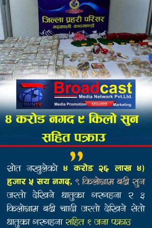 #४ करोड २६ लाख ४० हजार ५ सय नगद, ९ किलोग्राम बढी सुन सहित १ जना पक्राउ